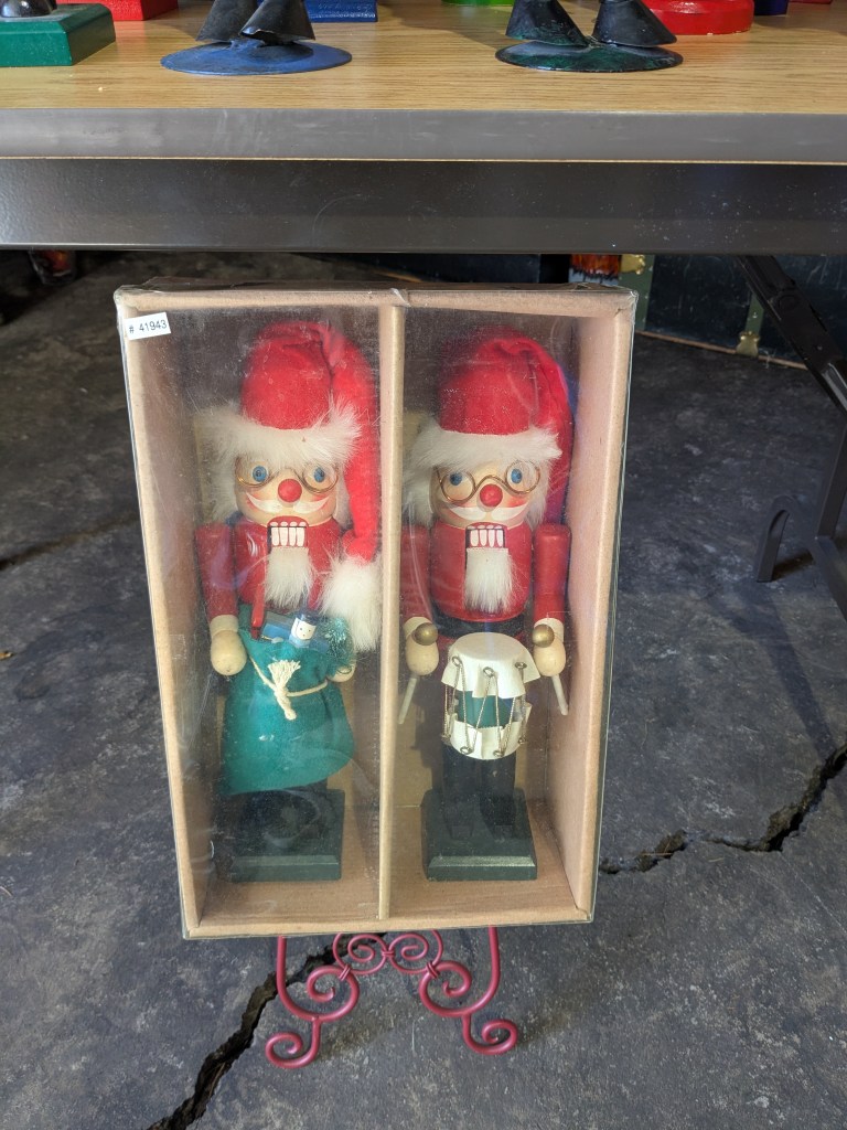 Quand je regarde cette table dans mon atelier, je ne peux m’empêcher de sourire. Plus d’une cinquantaine de casse-noisettes s’y alignent fièrement, créant un véritable spectacle visuel. Certains sont imposants, dépassant facilement les 40 centimètres, tandis que d’autres, plus modestes, forment l’infanterie de cette armée décorative. Il y a les pièces encore dans leur boîte d’origine, comme ce duo de Pères Noël que je garde précieusement au premier plan, et puis tous les autres, déployés en rangées multicolores. Rouge, bleu, or, noir, vert – chaque couleur se répète et se répond dans une chorégraphie festive. Au fil des ans, cette collection est devenue bien plus qu’une simple décoration des Fêtes : c’est un véritable passe-temps qui m’anime.